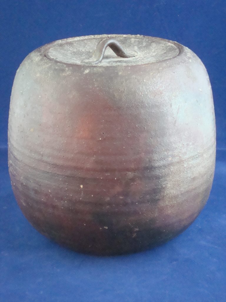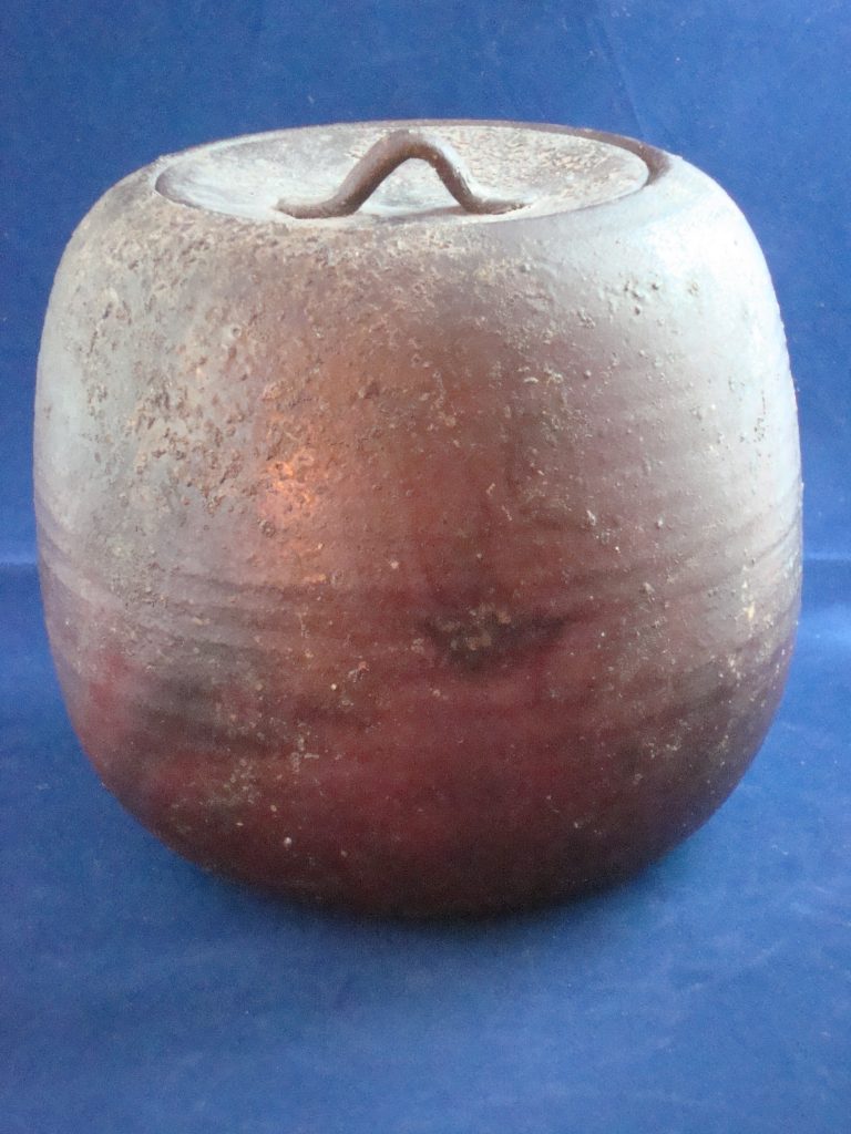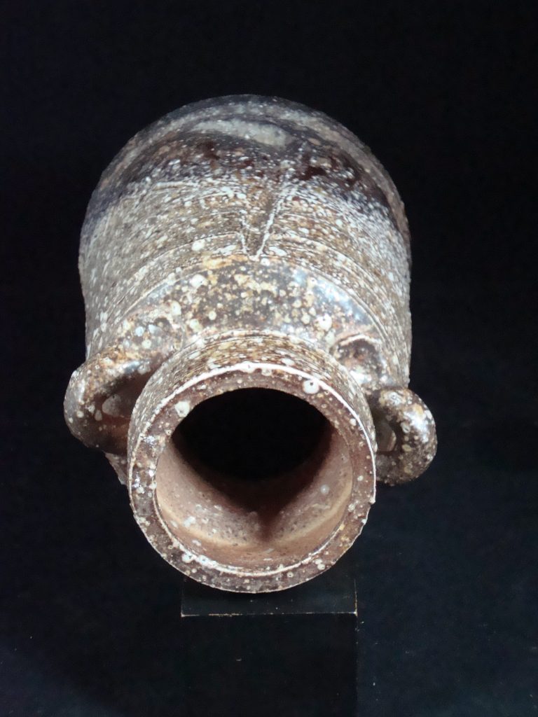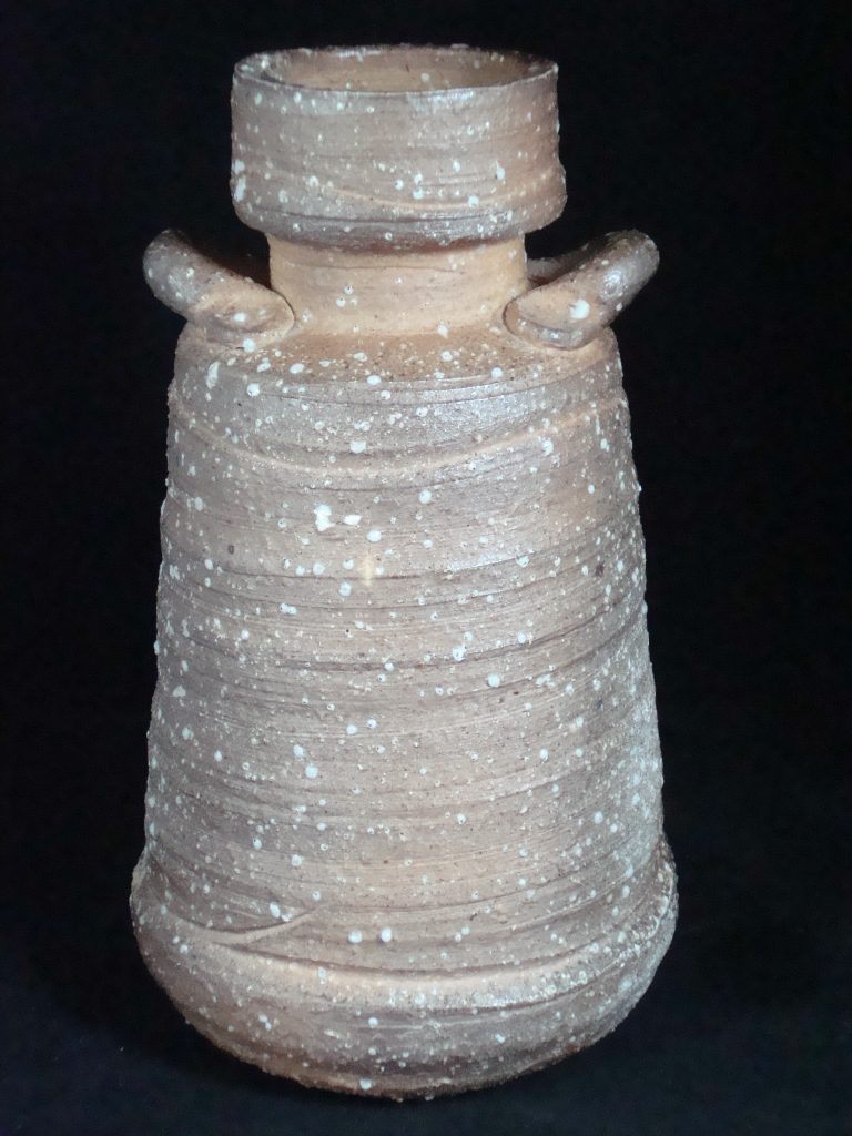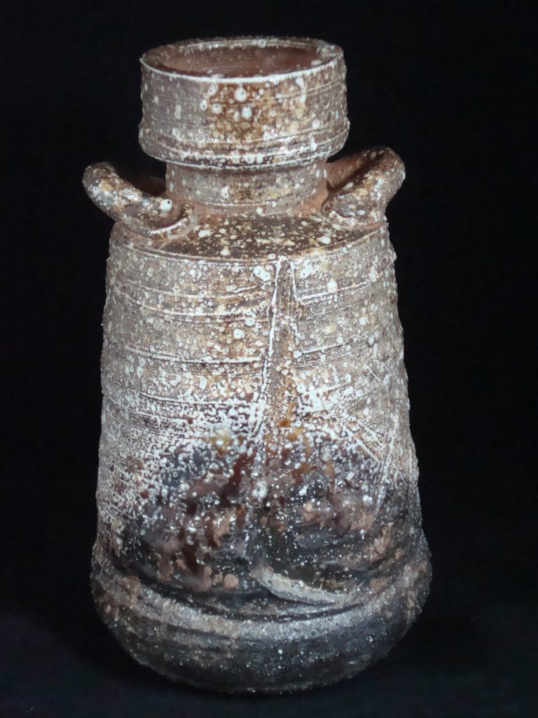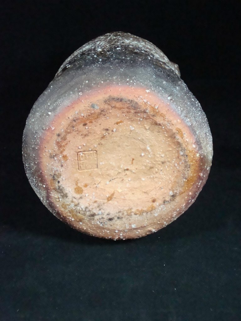 A signed vase acquired from the artist in 1975.Shigaraki ware is a pottery produced mainly in Shigaraki area in Koka city, Shiga prefecture. Shigaraki ware is characterized by its distinctive form brought by the wood firing; the reddish-orange (scarlet) color from oxidation of iron in the clay, natural ash glaze acquired from the deposit of ashes in the kilns, and “Koge (Burn)”, the result of being buried under embers during firing. Rustic surface caused by inclusion of fine stone particle such as a piece of quartz, feldspar or silica is also characteristic of Shigaraki ware. It is often said that Shigaraki pottery and Iga pottery have similarities in style. This is because both Shigaraki and Iga are produced in neighboring district and use the same clay from Lake Biwa. It is the clay that brings forth the warmth and simplicity of “Ko-Shigaraki(Old Shigaraki)”.