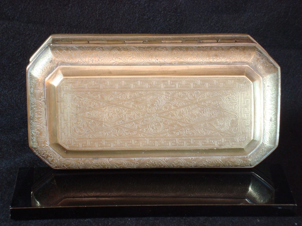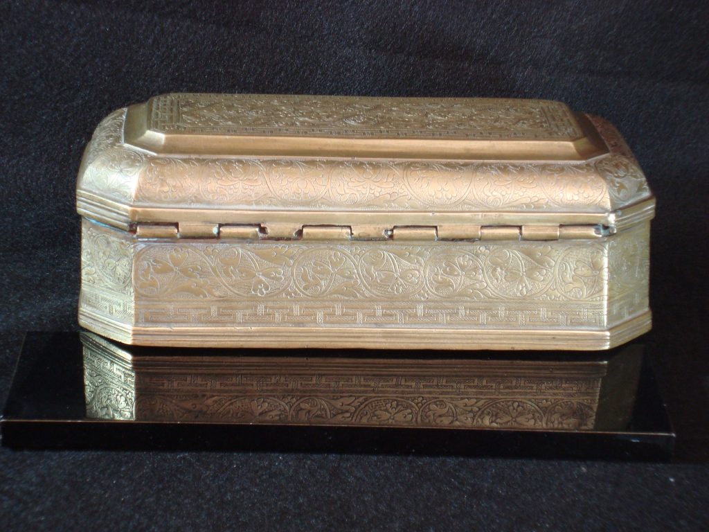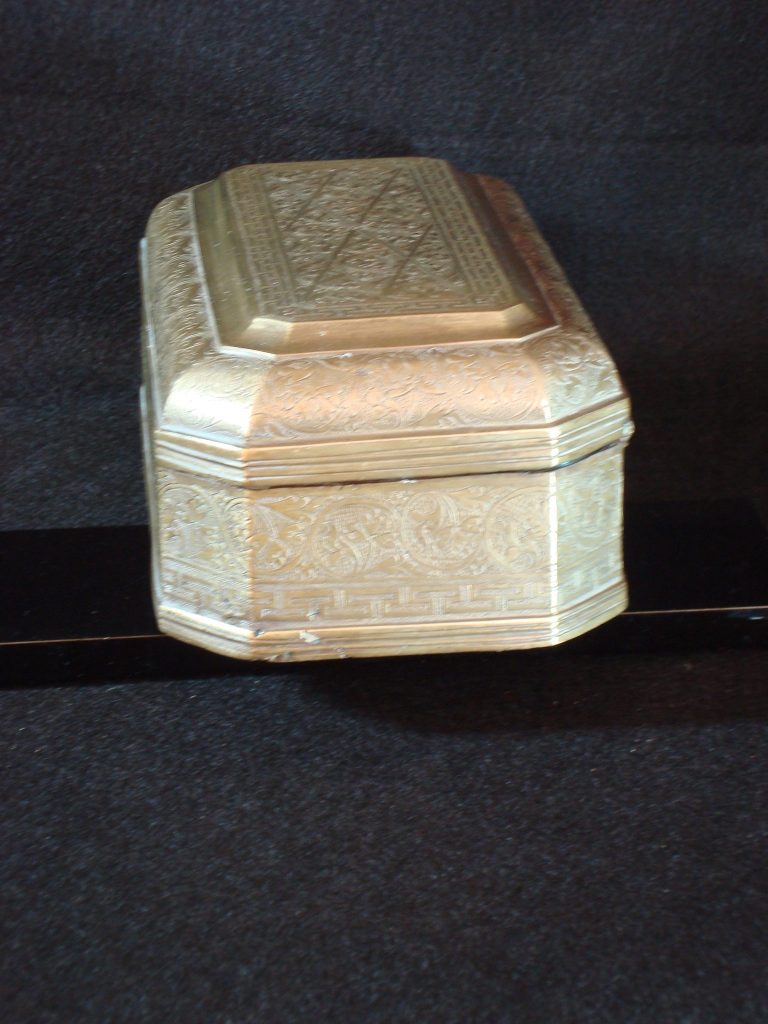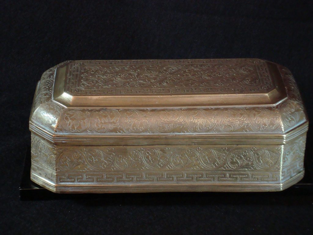 A richly decorated 19th century brass box from Palawan, Philippines. It shows a combination of Chines cloud patterns with designs of flowers similar to those found in Java. Acquired in Palawan in 1978