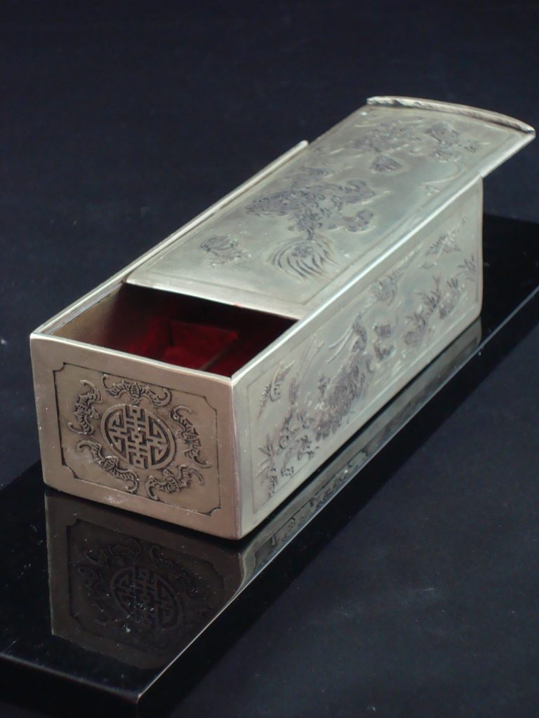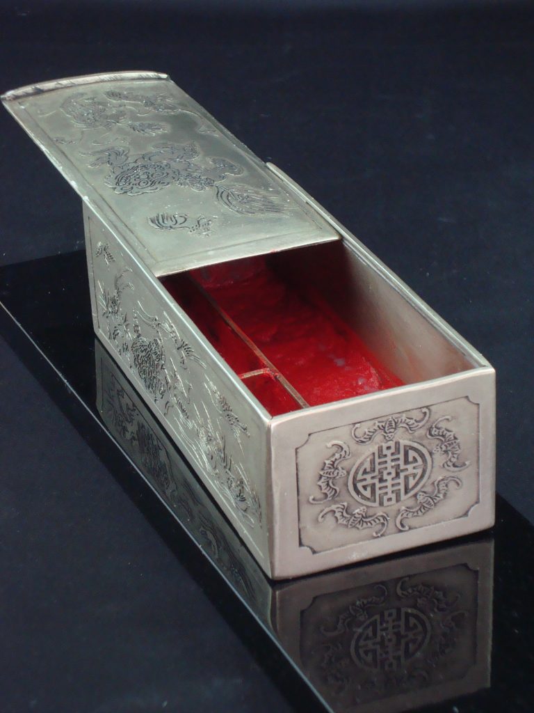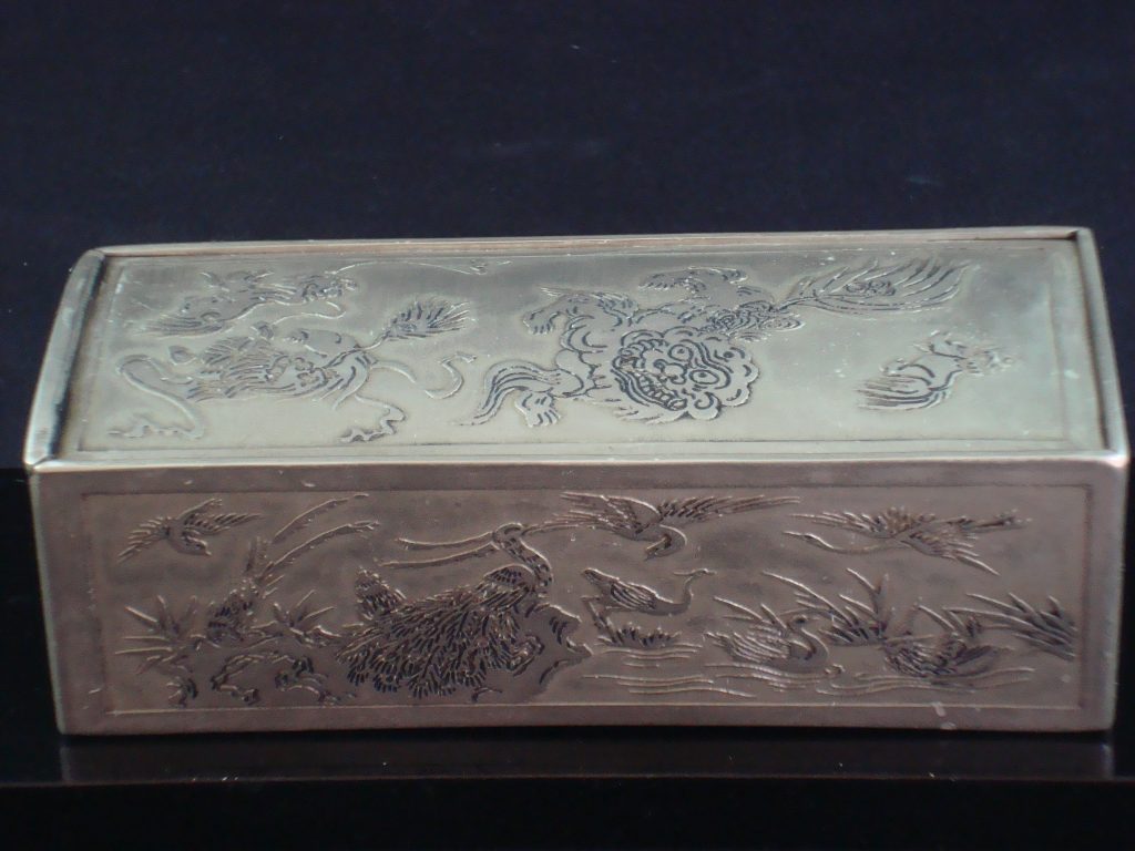 A nicely-decorated ink box circa 1900. The box still contains solid red ink used for the chop. Decorated on top with Foo dogs, on the sides with cranes and on the ends with the charaters of good fortune. In brass silver-coated.