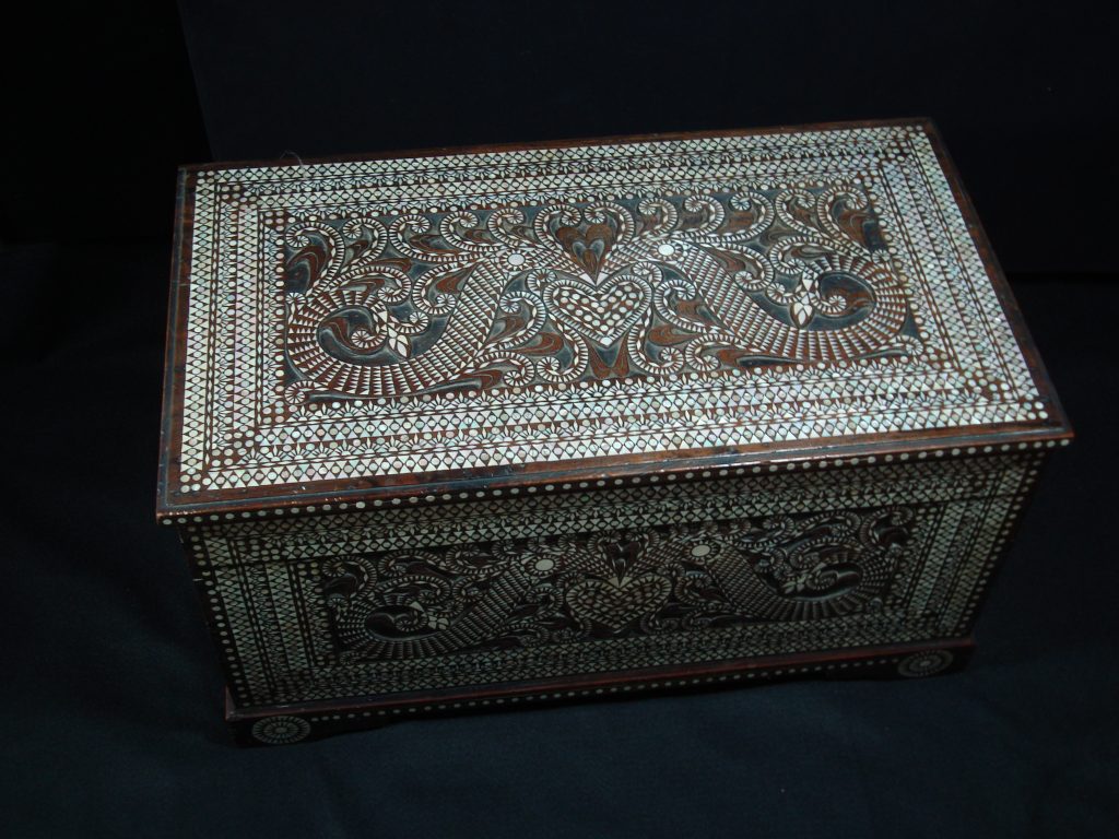 Philippines, Mindanao Chest of Museum quality, late 19th century, encrusted with mother-of-pearl design of dragons on top and sides.