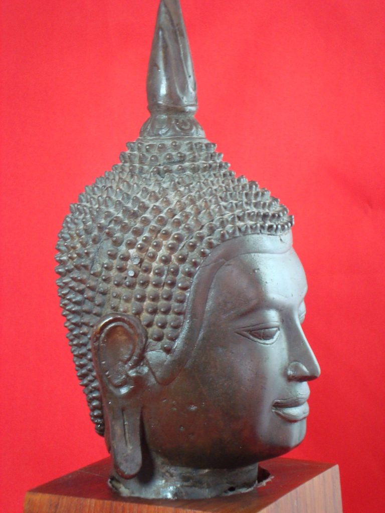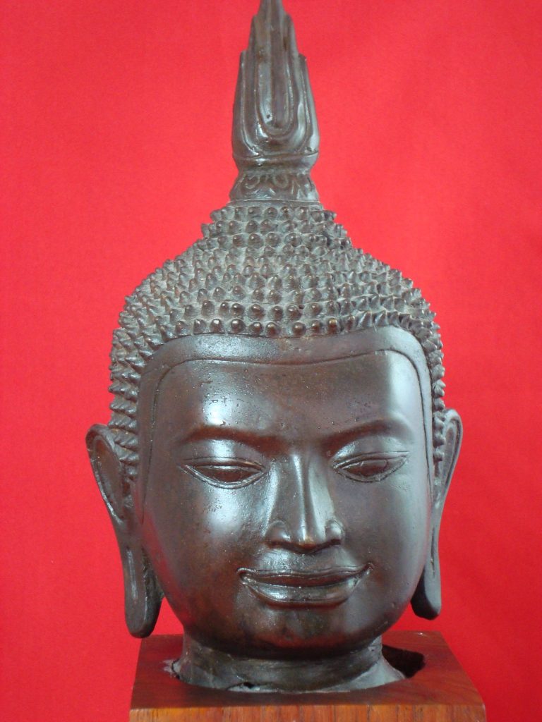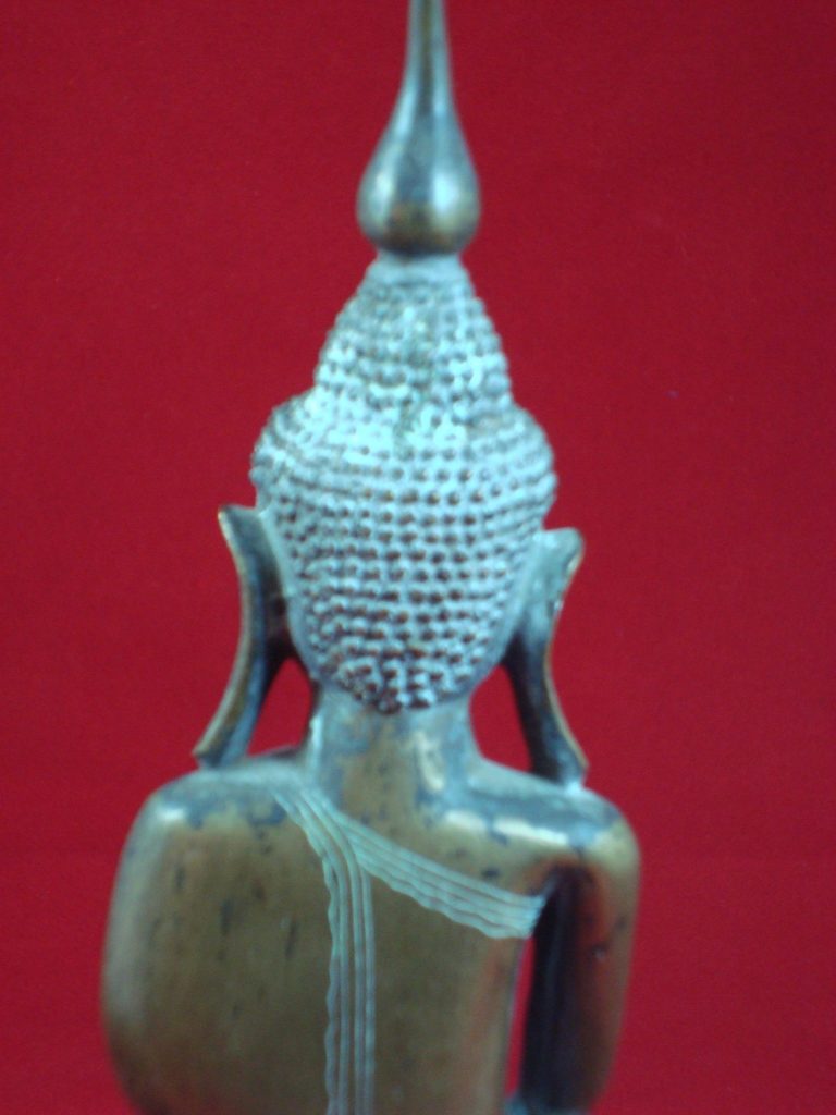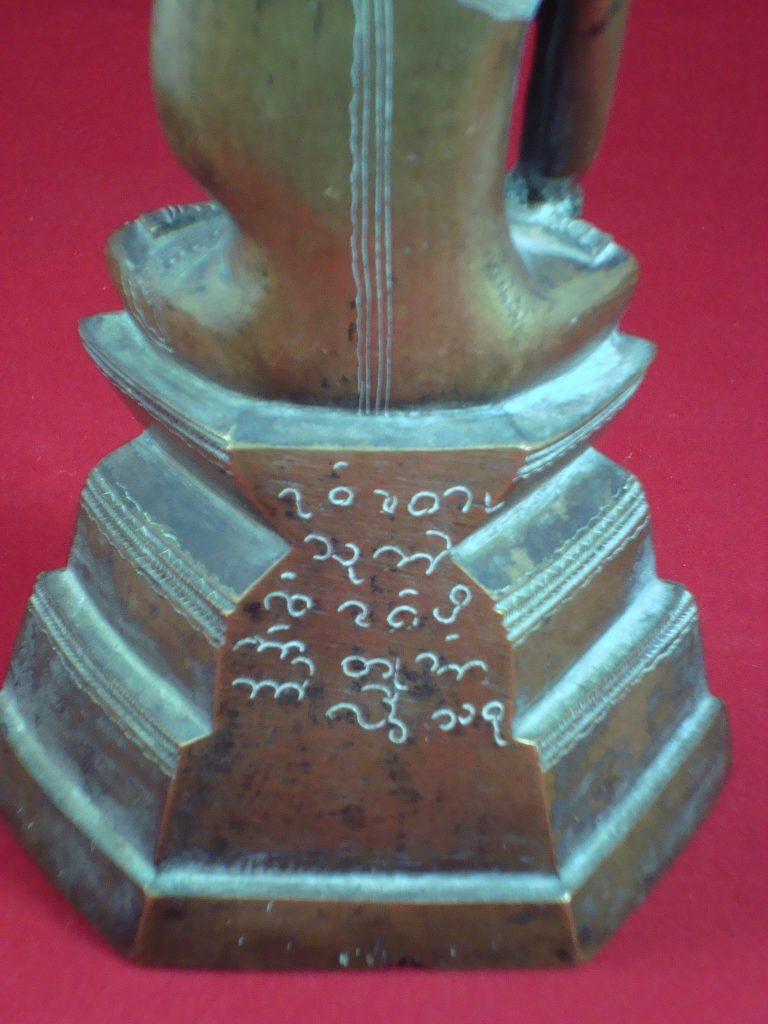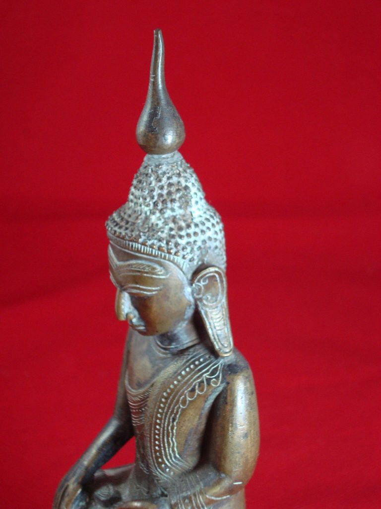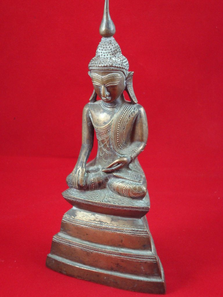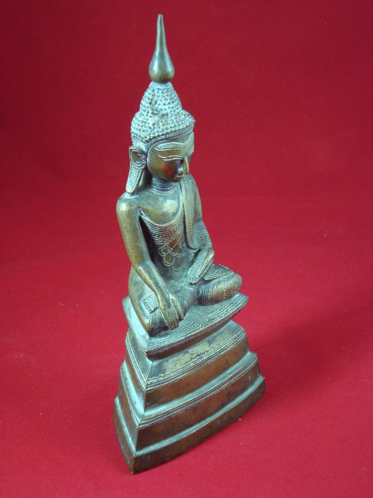 A Bronze Burmese Buddha from Shan State from the 15th Century. The Statues depicts Buddha subduing the demon Mara. The Buddha sits on a high-stepped throne tapering towards the top – a characteristic of Shan artists. The statues has a dedication on the back. The Shan also referred to as Tai people, originated from Yunnan in the Southern part of China. When Kublai Khan invaded Pagan in the 13th century, the Shan migrated behind them in Laos, Thailand, Burma, Vietnam and India. The Shan established the Ava and Pinya dynasties’ and during this time conquered parts of west and south Burma.