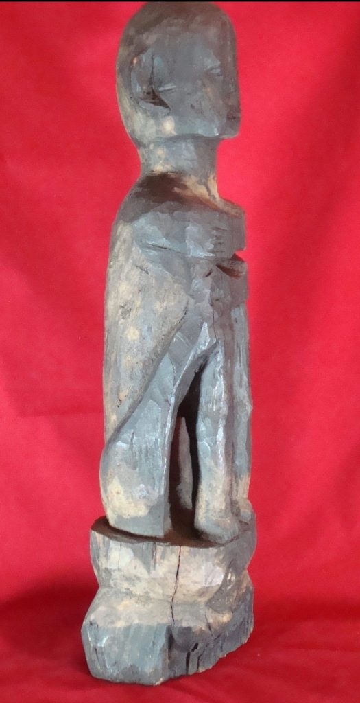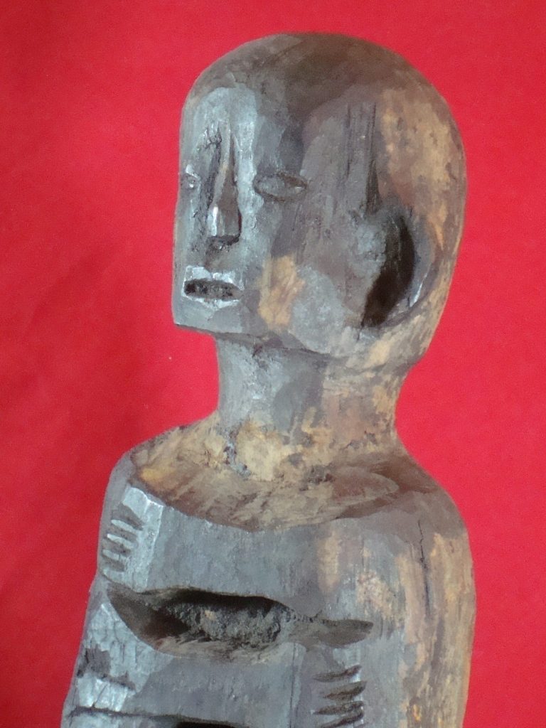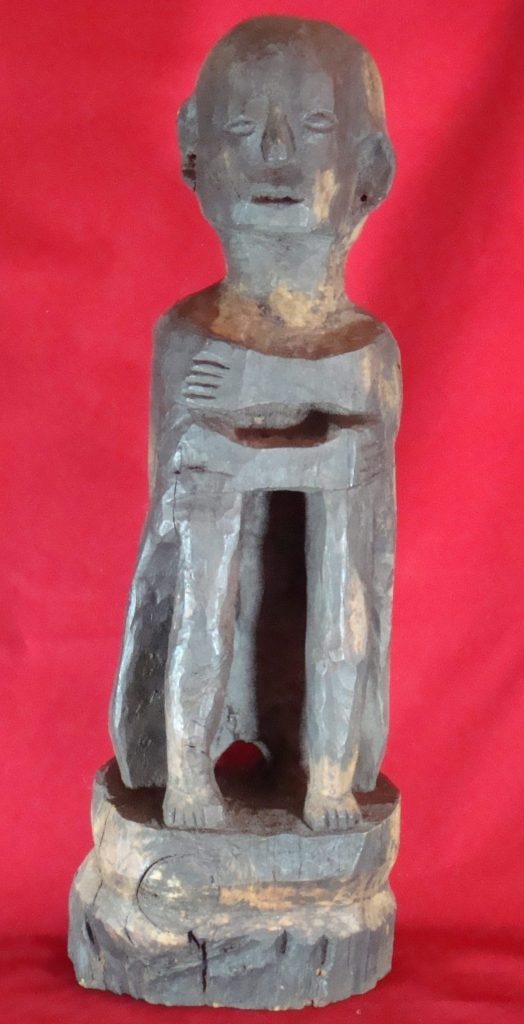A large Ifugao bulul acquired near Baguio, Philippines in 1978. In sitting position to guard the rice reserves. Ifugao culture is based on rice which is considered to be a prestige crop. The bulul guards this granary and is treated with respect. It is carved from narra or ipil wood and is particularly heavy. The bulul is touched by hands dipped in blood of a chicken and this was the case by the author upon buying this bulul. The bulul takes this dark color from the chicken blood as well as grease offerings. In good condition with some natural knots and cracks in the wood (visible in pictures)