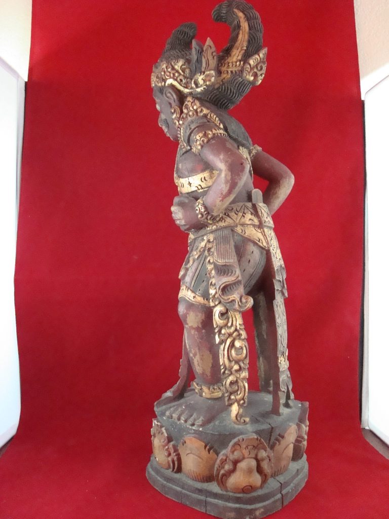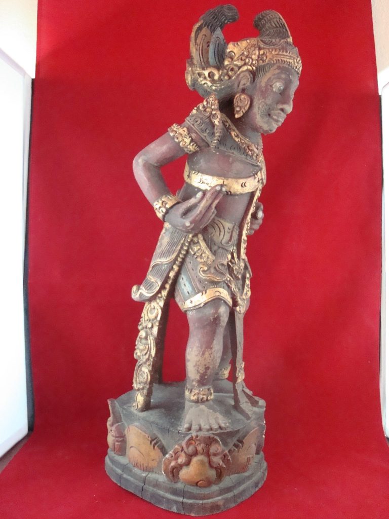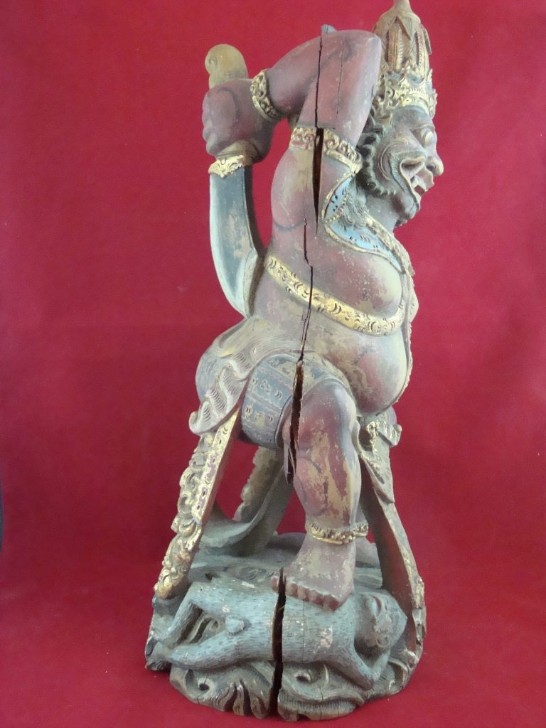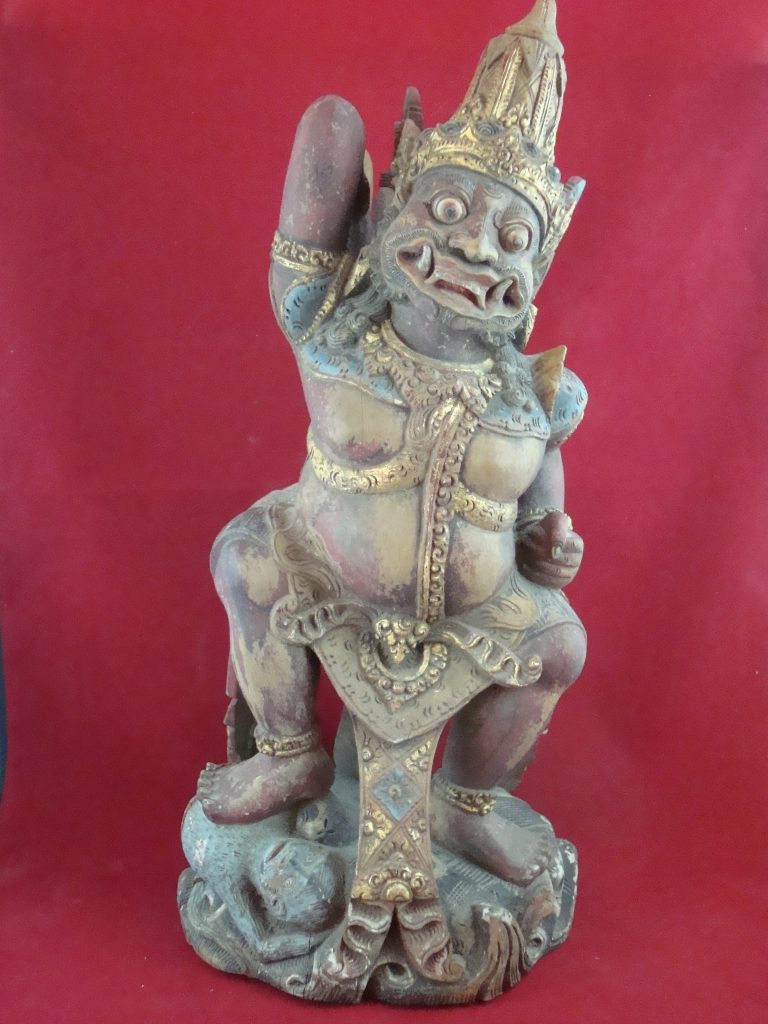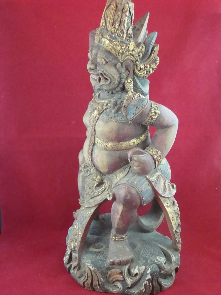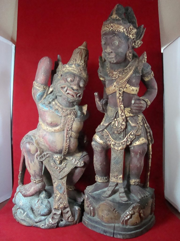 A pair of old Begodol acquired in Bali in 1969 probably 20-30 years old at that time or circa 1939. Begodol or Dwarapala is the Balinese name for the gate guardian statues which were placed in Pura (temples) and Puri (royal homes) but currently can be found in kost houses in Bali. The statues are placed on the left and right side of the gate. Most balinese use the male-female Dwarapala which sometimes look alike and sometimes are different. They are the equivalent of the Chinese ying-yang, good-bad, positive-negative…etc. The Barong statue has a crack seen in the picture but remains a well-executed carving with fine details including the monkey on which the Dwarapala is stepping.
