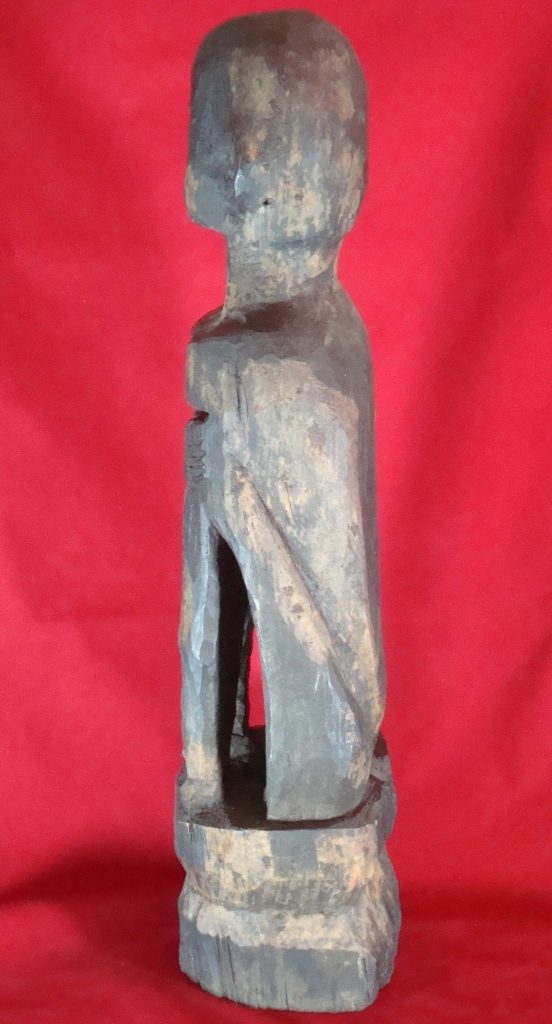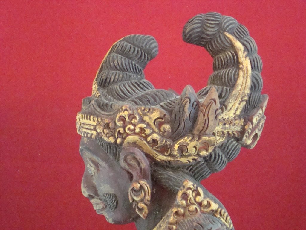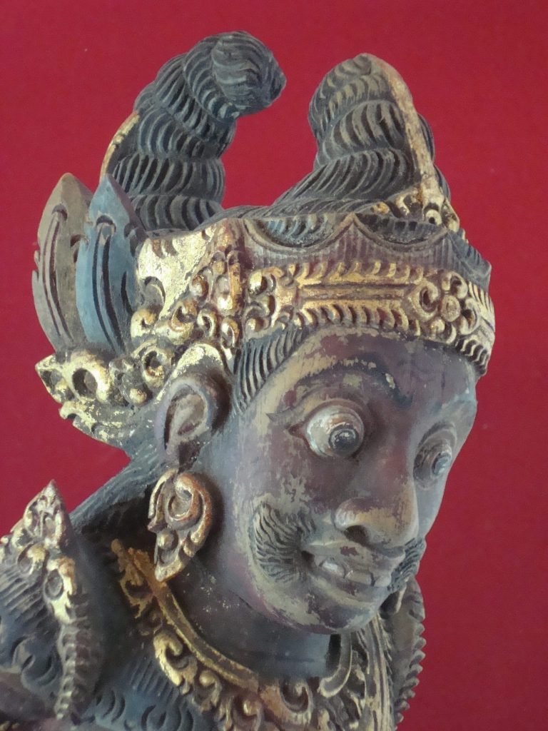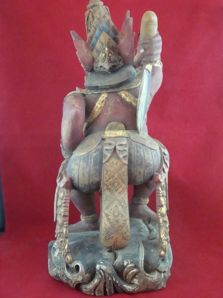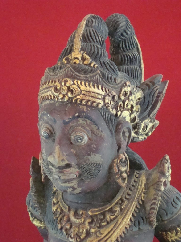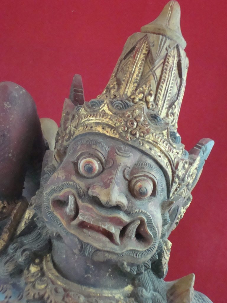 A pair of old Begodol acquired in Bali in 1969 probably 20-30 years old at that time or circa 1939. Begodol or Dwarapala is the Balinese name for the gate guardian statues which were placed in Pura (temples) and Puri (royal homes) but currently can be found in kost houses in Bali. The statues are placed on the left and right side of the gate. Most balinese use the male-female Dwarapala which sometimes look alike and sometimes are different. They are the equivalent of the Chinese ying-yang, good-bad, positive-negative…etc. The Barong statue has a crack seen in the picture but remains a well-executed carving with fine details including the monkey on which the Dwarapala is stepping.