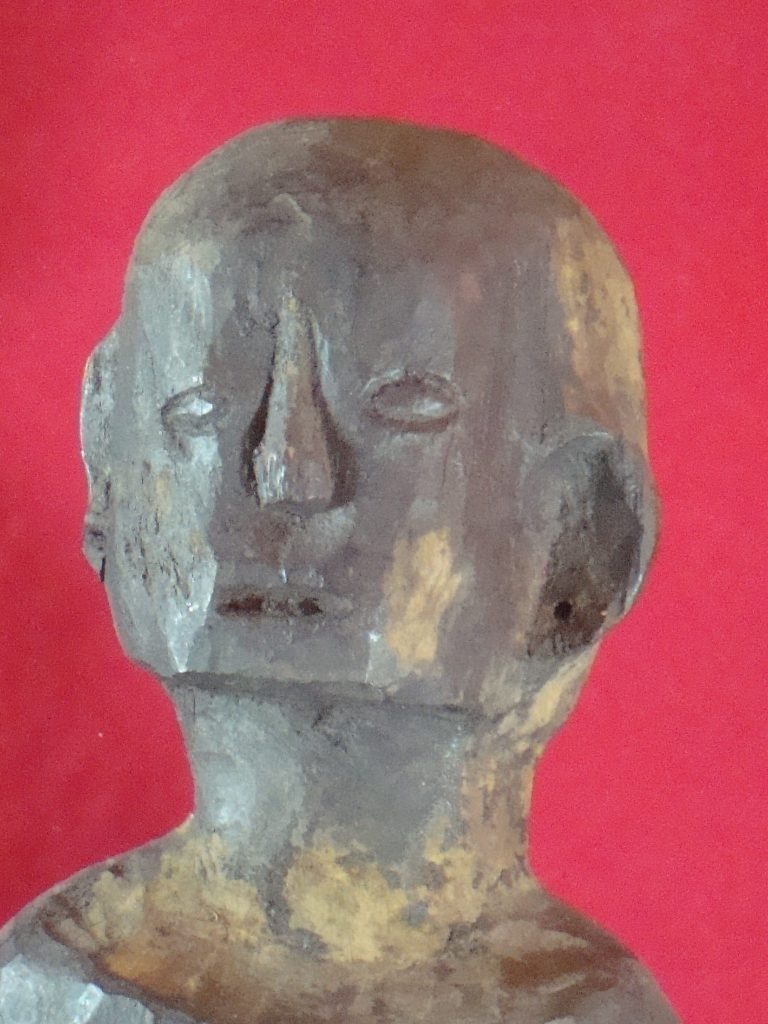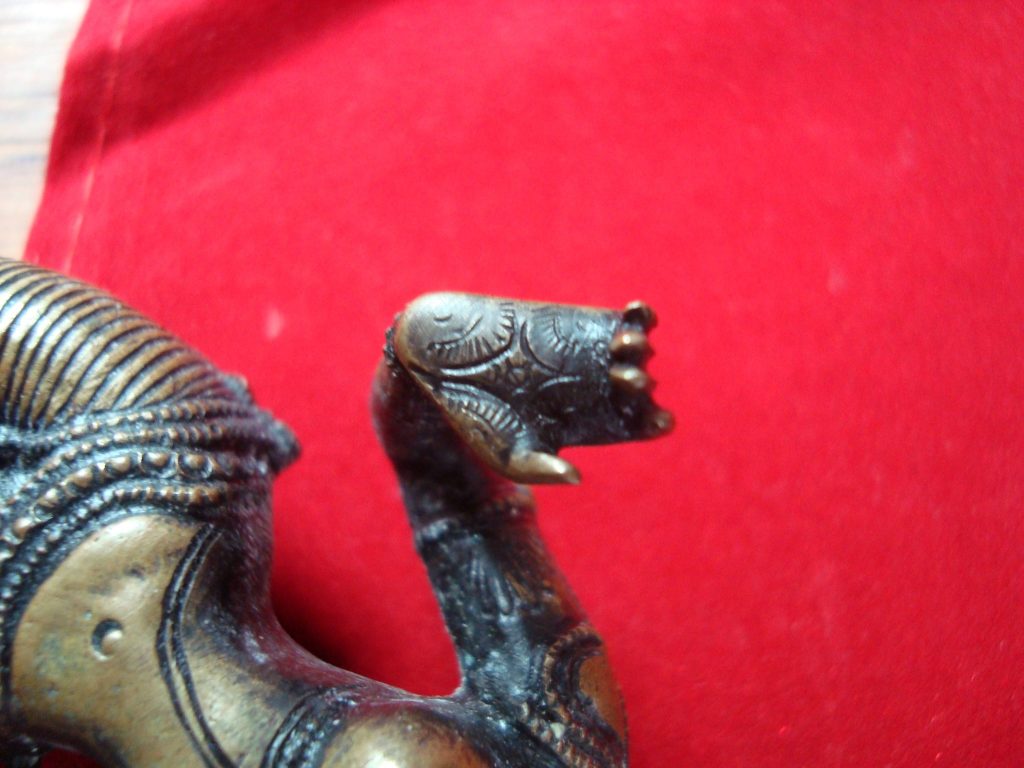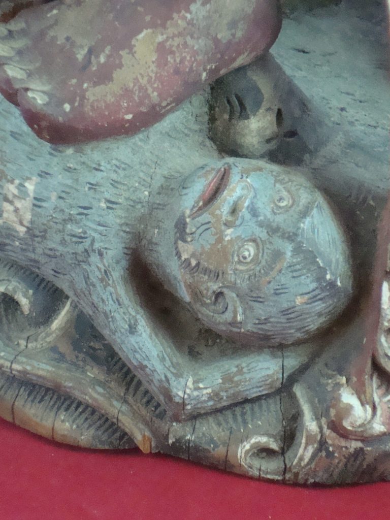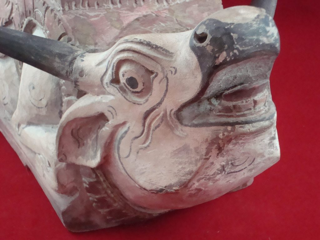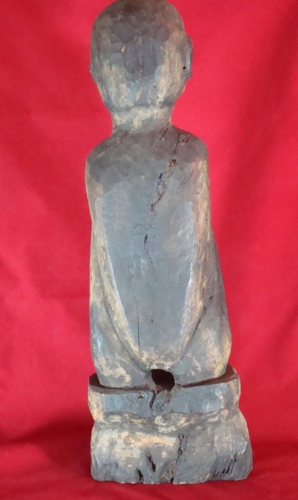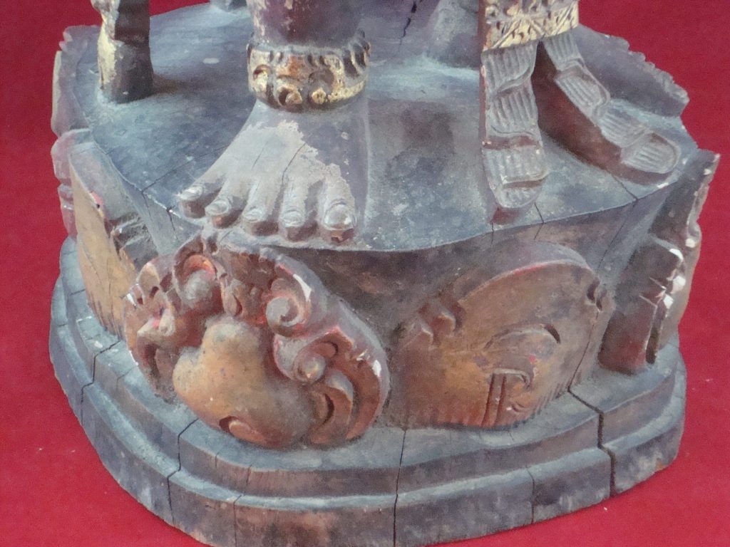 A pair of old Begodol acquired in Bali in 1969 probably 20-30 years old at that time or circa 1939. Begodol or Dwarapala is the Balinese name for the gate guardian statues which were placed in Pura (temples) and Puri (royal homes) but currently can be found in kost houses in Bali. The statues are placed on the left and right side of the gate. Most balinese use the male-female Dwarapala which sometimes look alike and sometimes are different. They are the equivalent of the Chinese ying-yang, good-bad, positive-negative…etc. The Barong statue has a crack seen in the picture but remains a well-executed carving with fine details including the monkey on which the Dwarapala is stepping.