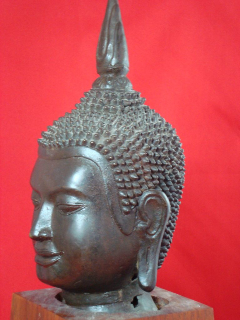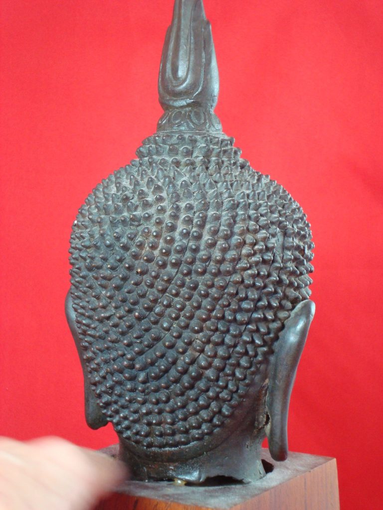 A U-Thong B Style (13th to 14th Century) acquired in Ayutthaya in 1969 showing the fusion of styles between Mon and Thai with a solid, corporeal and squared-off U Thong image. The head is more square than oval with a small band between the hairline and forehead. The hairstyle is small and spiky-curly. The head is in excellent condition with small hole on left side of neck (visible on picture). Currently mounted on hardwood base.