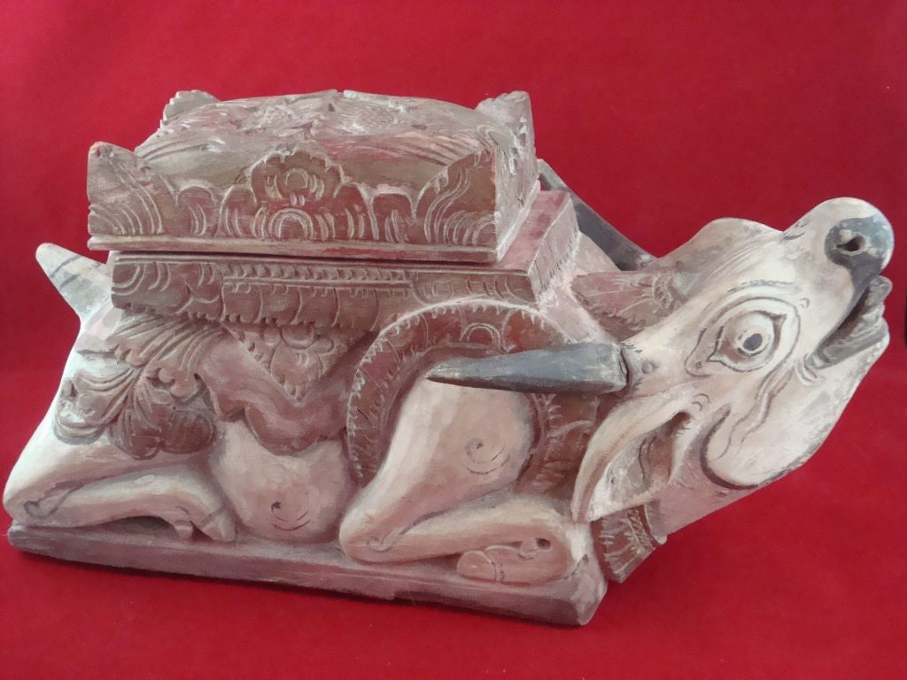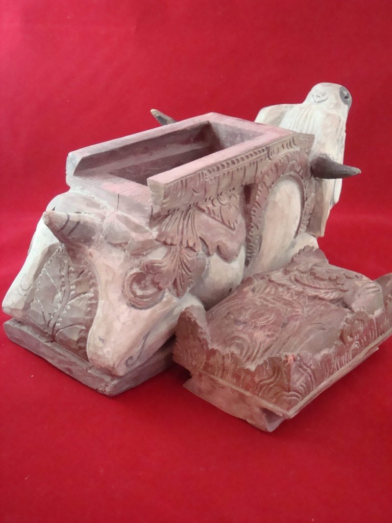 A pair of carved bulls acquired in Bali in 1969 and probably 20 years old at that time. These bulls are in the shape of a box probably for temple offerings. In good condition without cracks or repairs